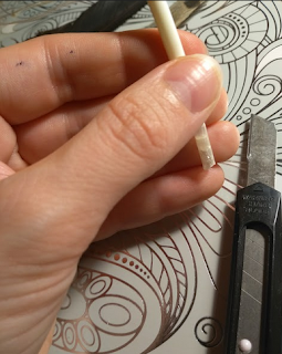 A másik penna, mivel a hegy jóval szélesebb, a tollszár hegyének lecsippentésén túl egy plusz vágást igényel - a tollszárat hosszában be kell metszeni, ismét roppantul ügyelve az ujjakra. Ez lehetővé teszi, hogy belecsúsztasd a hegyet, majd ugyanúgy körbetekerd a fonallal, mint a másik variánst.